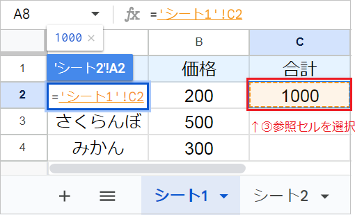 参照したいシートに移動したら、値を取りたいセル(例:C2)をクリックします。