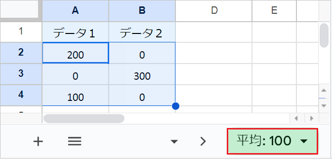 平均値を確認したい数値が入力されているセル範囲全体を選択すると、スプレッドシートの右下に合計値などの集計結果が表示されます。