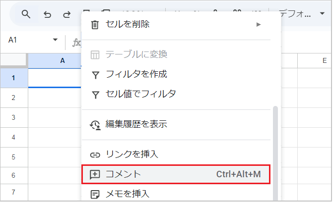 - 右クリックメニューから「コメント」を選択します。