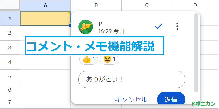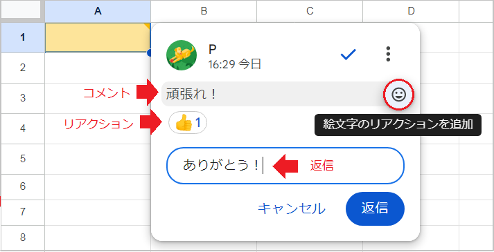 このセルをクリックすると、コメントの確認や、「リアクション」、「返信」ができます。