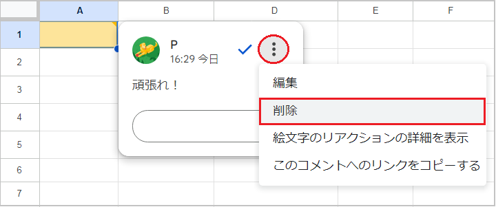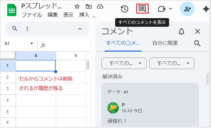 シート右上の「すべてのコメントを表示」を開き、削除したいコメントを選択します。右側の「その他オプション(⋮)」→「削除」を選択します。