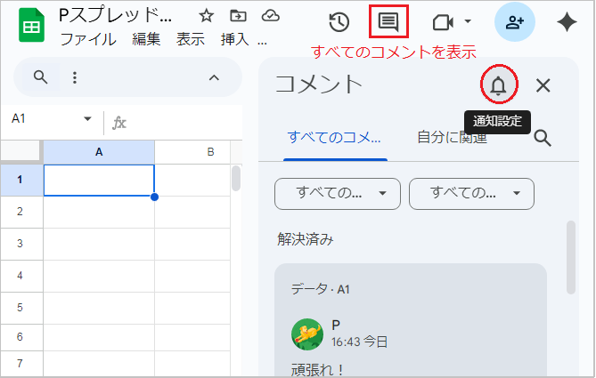 シート全体のコメント通知をオフにしたい場合は、以下の手順で設定します。