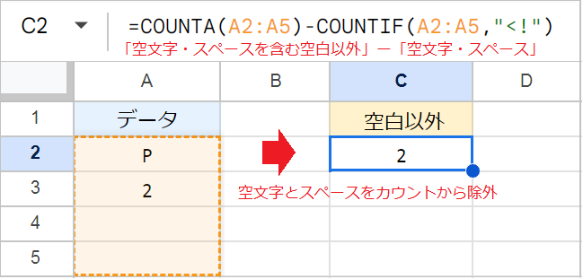 "<!"は、空文字("")とスペースのセルのみカウントします。- 「数式の空文字」と「半角・全角スペース」を完全に除外できます。