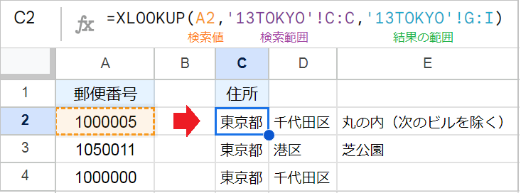 例:=XLOOKUP(A2,'13TOKYO'!C:C,'13TOKYO'!G:I)