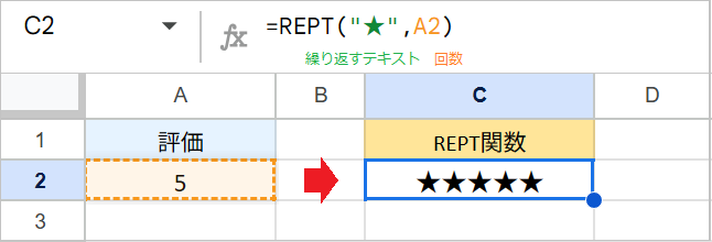 例:=REPT("★",A2)