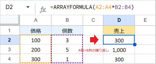 例:=ARRAYFORMULA(A2:A4*B2:B4)