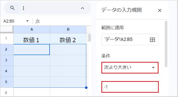 • 条件を「次より大きい」に設定し、数値に -1 などの負の値を入力します。