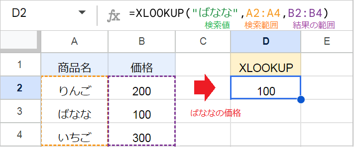 例:=XLOOKUP("ばなな",A2:A4,B2:B4)
